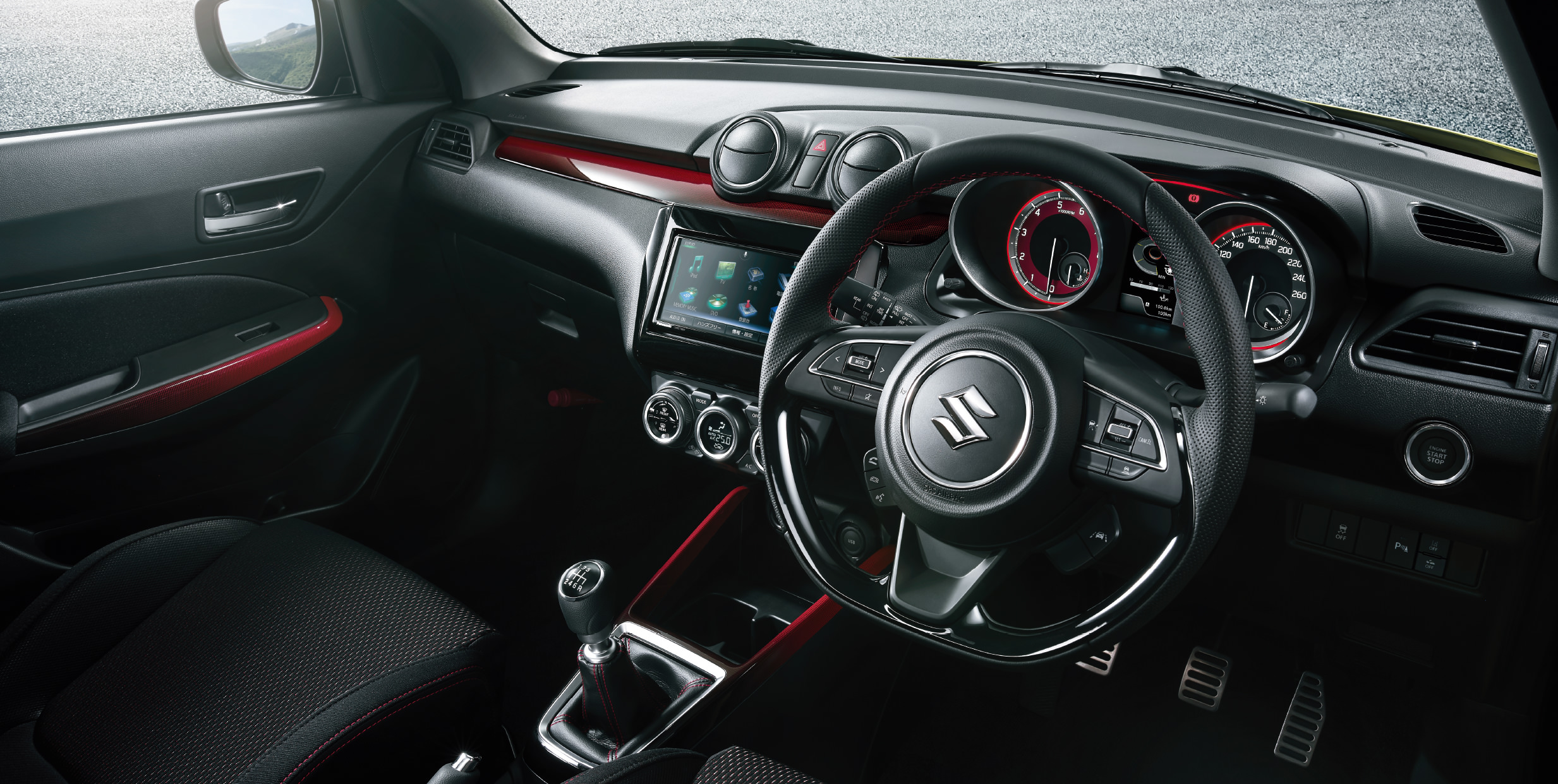 操作性に優れた洗練のコックピット。艶やかな輝きを放ち、レッドからブラックへとグラデーションするガーニッシュが、あなたを走りへと駆り立てる。