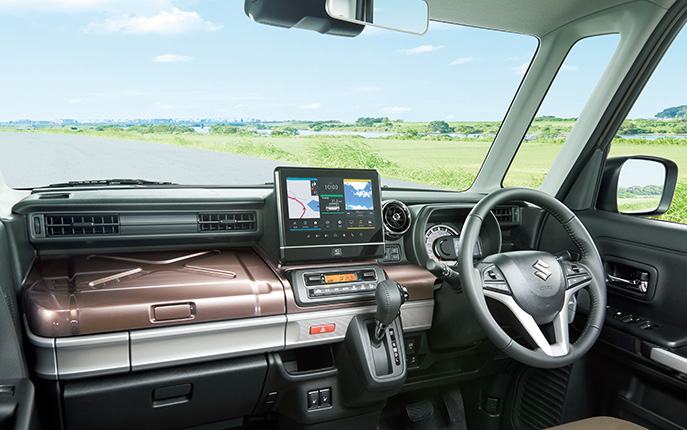 内装は道具類に囲まれたガレージのような空間をイメージさせます。インパネ部分のデザインや収納も特徴的でワクワクさせてくれます。シートは全席撥水加工が施されており、水に濡れてしまってもさっと拭き取れる点が安心で嬉しいポイントです。川遊びやスノーボードなど季節問わずアウトドアを楽しむことができます。マイスタイルの内装はインパネやシートがブラウンでまとめられており、落ち着いた印象です。スピードメーターリングにはシルバーが、エアコンルーバー、本革巻シフトノブのノブボタンにはメッキでアクセントが入っています。シートはライトブラウンのファブリックシート表皮にホワイトステッチが施されています。