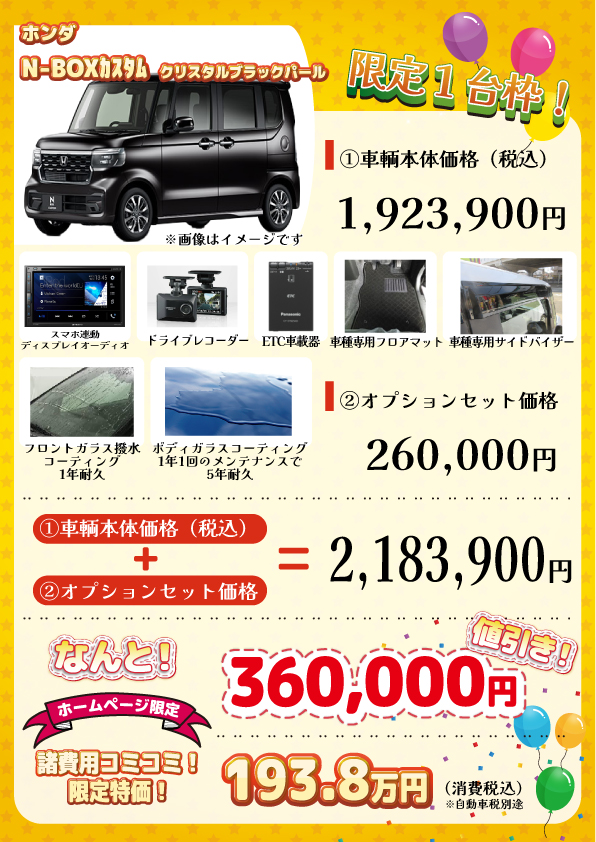 車輌:【限定2台枠】新車 N-BOXカスタム(クリスタルブラックパール)
