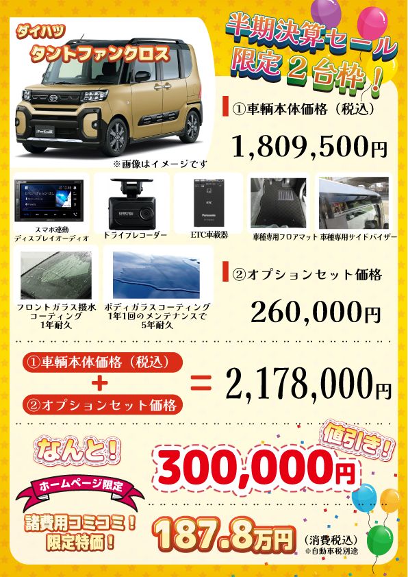 累計販売台数10,000台超の実績!新車ネオは未使用車よりもお安く、新車タントファンクロスの購入が可能です。新車タントファンクロスに、スマホ連動ディスプレイオーディオや、ETC、ボディコーティング等を付けてお得に販売いたします。
