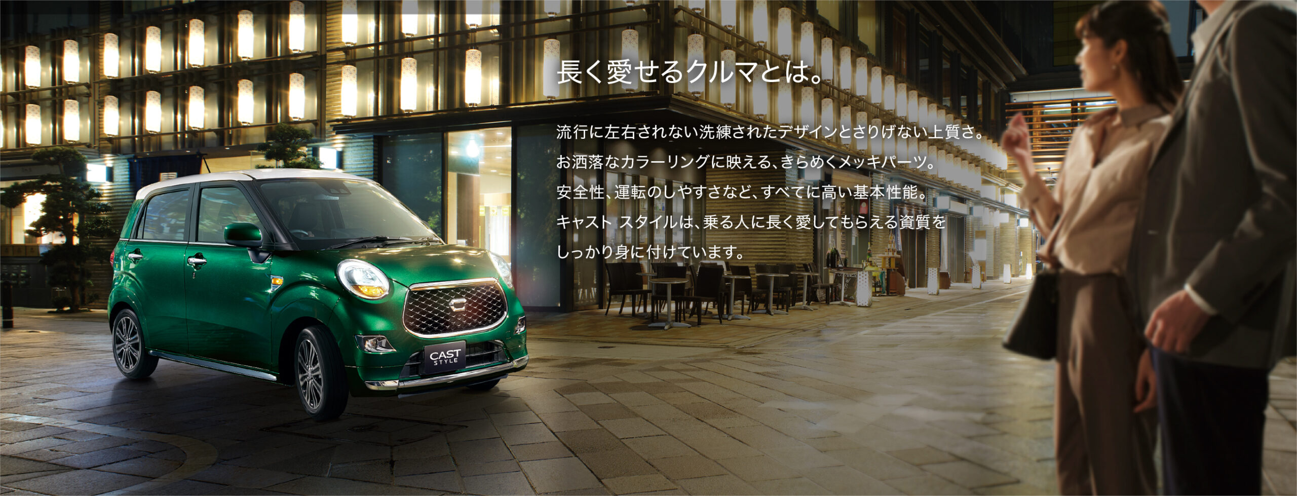 いいものを選んで長く大切に使いたい。そんな時代の気分にぴったりなスモールカーがあります。流行に左右されない洗練されたデザインとさりげない上質さ。お洒落なカラーリングに映える、きらめくメッキパーツ。安全性、運転のしやすさなど、すべてに高い基本性能。キャストスタイルは、乗る人に長く愛してもらえる資質をしっかり身に着付けています。