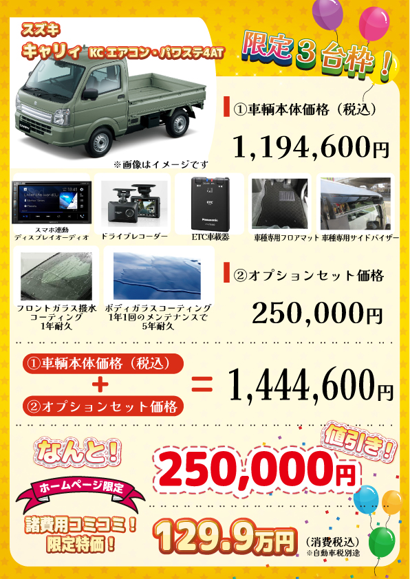 ネット販売840台の実績!新車ネオは来店不要で、新車キャリィの購入が可能です。新車キャリィに、スマホ連動ディスプレイオーディオや、ETC、ボディコーティング等を付けてお得に販売いたします。