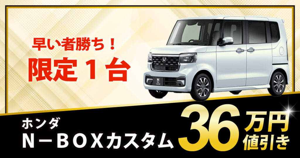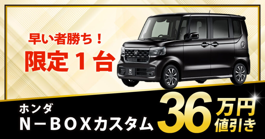 早い者勝ち!N-BOXシリーズ大放出!通常時お値引き26万円のところ今ならさらに10万円引きでとってもオトク!新車のN-BOXカスタムに、スマホ連動ディスプレイオー... -